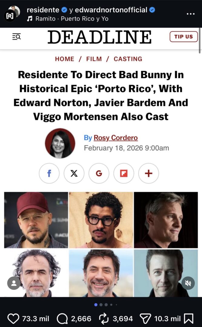 El artista puertorriqueño Bad Bunny dará un paso importante en su carrera al protagonizar Porto Rico, la primera película dirigida por el también puertorriqueño Residente (René Pérez Joglar), anunciada este 18 de febrero. El largometraje histórico, descrito como un “wéstern caribeño épico”, reunirá a un elenco de estrellas que incluye a Javier Bardem, Edward Norton y Viggo Mortensen.