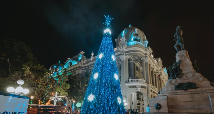 La noche de este lunes 1 de diciembre, la plaza de la Administración, en los bajos del edificio municipal de Guayaquil, se iluminó con el tradicional encendido del árbol de Navidad.