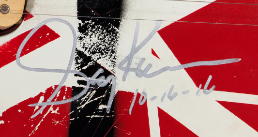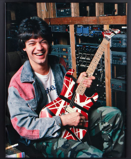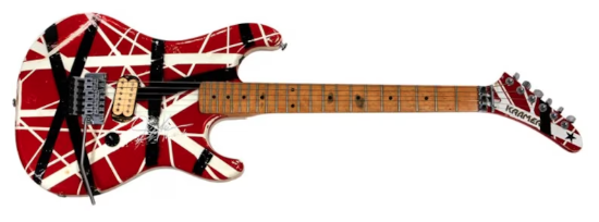La guitarra, personalizada por Van Halen en 1984 y con desgaste visible por su uso intensivo, fue ganada por un fanático en 1985 tras un concurso en el NAMM Show, y hoy está respaldada por documentación de autenticidad y cartas de procedencia. Entre sus detalles distintivos se encuentran las iniciales del técnico histórico Rudy Leiren grabadas bajo los resortes del trémolo.