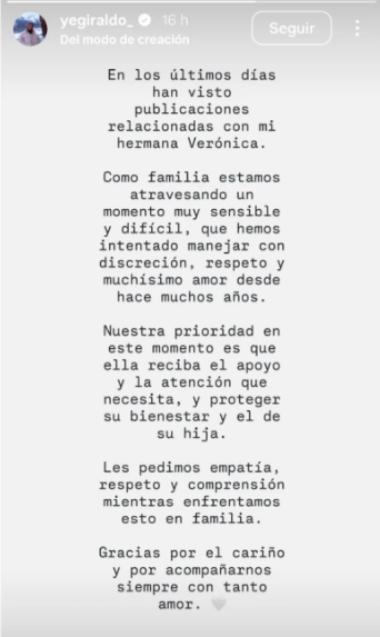 Tras la difusión de los videos, la cuenta de Instagram de Verónica fue desactivada, y Jessica Giraldo, hermana de Karol G y su mánager, publicó un comunicado pidiendo respeto y empatía, señalando que la familia está atravesando un momento “muy sensible y difícil” y que su prioridad es apoyar tanto a Verónica como a la menor.