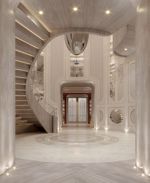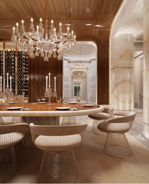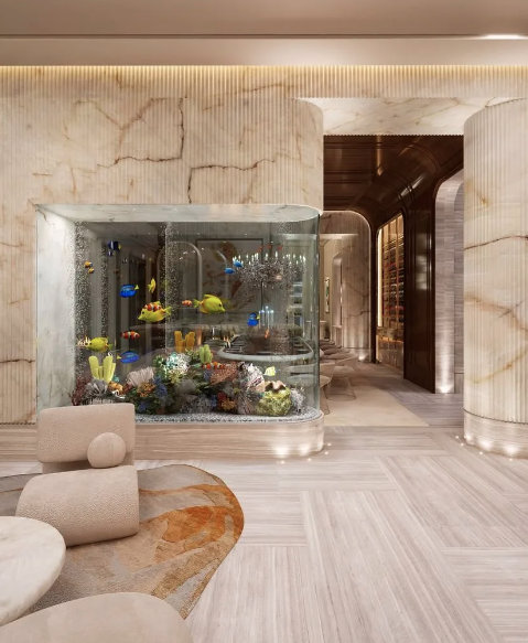 El complejo contará con nueve dormitorios, once baños, amplias zonas de entretenimiento, gimnasio, spa, cine privado y una gran piscina con jardines. También incluirá elementos llamativos como una biblioteca con pasadizo secreto, un acuario y un muelle privado con acceso directo a la bahía.