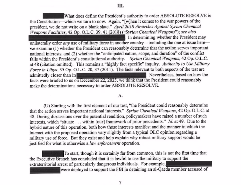 La base legal del operativo en Fuerte Tiuna se sustentó en la peligrosidad atribuida a Maduro, vinculado por la inteligencia estadounidense con el narcotráfico y organizaciones armadas extranjeras. El informe advertía sobre los riesgos de represalias y las consecuencias políticas internacionales, aunque ratificaba que el presidente tenía autoridad suficiente para ordenar el uso restringido de fuerzas especiales. Entre los detalles operativos, se contempló el uso de sabotajes eléctricos y apoyo aéreo para minimizar la resistencia de los cuerpos de seguridad venezolanos. Once días después de la emisión de este dictamen, las fuerzas militares ejecutaron la detención que culminó con el traslado de Maduro a Nueva York, marcando un precedente en el uso de facultades ejecutivas para acciones judiciales extraterritoriales.
