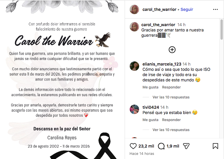 La influencer colombiana Carolina Reyes, conocida en redes sociales como Carol The Warrior, murió el 11 de marzo a los 23 años en una clínica de Cali, según confirmó su familia a través de un comunicado publicado en su cuenta oficial de Instagram.