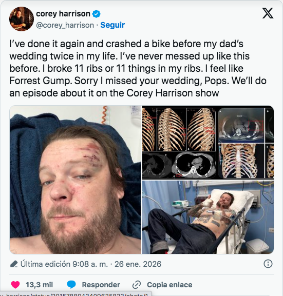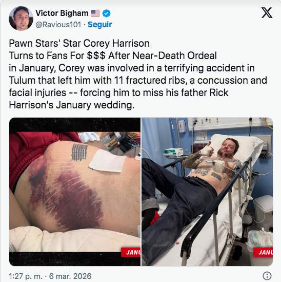 Corey, de 42 años, sufrió un grave accidente de motocicleta a finales de enero de 2026 en Tulum, México: 11 costillas fracturadas, conmoción cerebral, hemorragias internas y complicaciones que requirieron tres cirugías, drenaje de casi tres litros de sangre y más de un mes hospitalizado entre Playa del Carmen y Mérida. Las facturas superaron los 100.000 dólares (algunos reportes hablan de 120.000-130.000), dejando a Corey con solo 400 dólares en su cuenta, deudas de renta y necesidad de medicamentos y terapia.