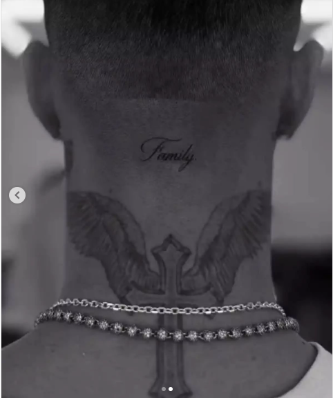 Romeo Beckham, de 23 años, debutó un nuevo tatuaje en la nuca con la palabra “Familia” en letra cursiva, superpuesta a una cruz y alas de ángel que ya tenía. El diseño fue realizado en el estudio Fine Line Hearts Club de Londres y compartido por el tatuador en Instagram, donde Romeo lo reposteó en sus historias. El tatuaje llega en medio de la tensa disputa familiar con su hermano mayor Brooklyn Beckham, de 26 años.